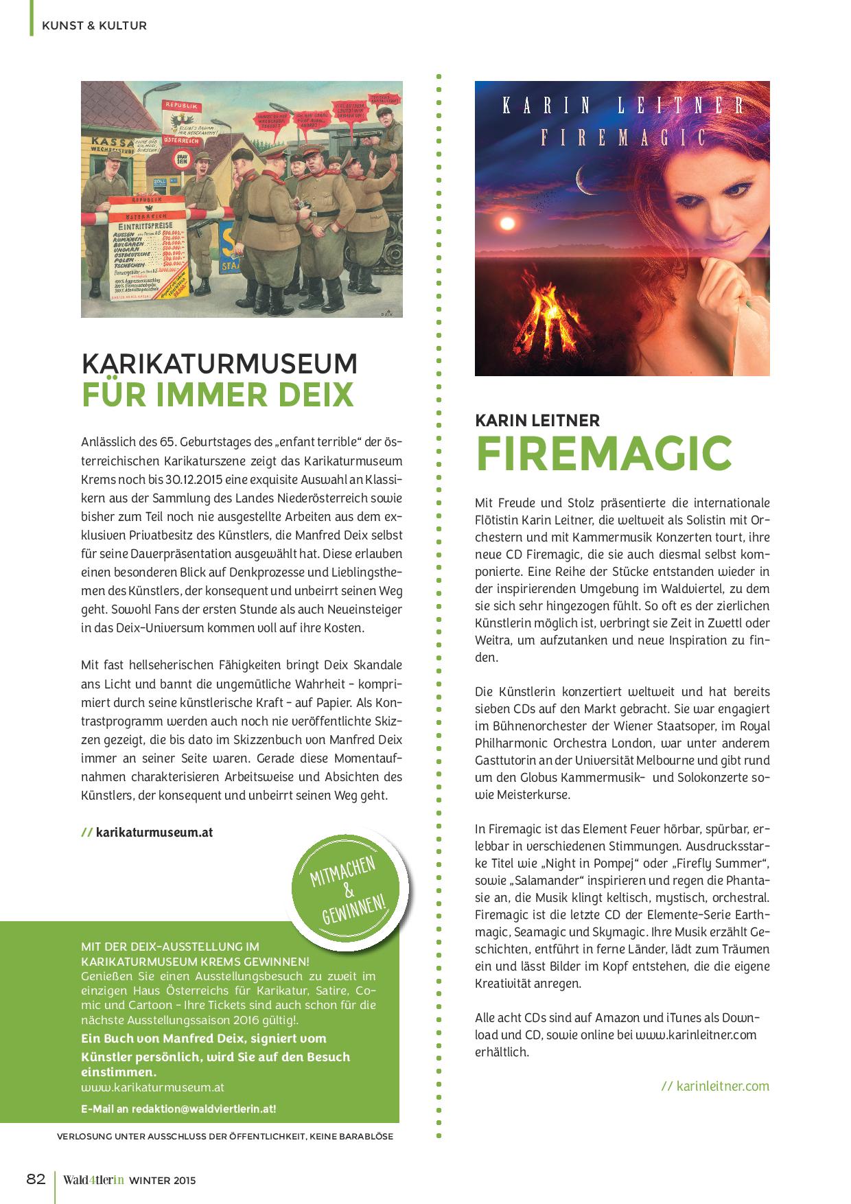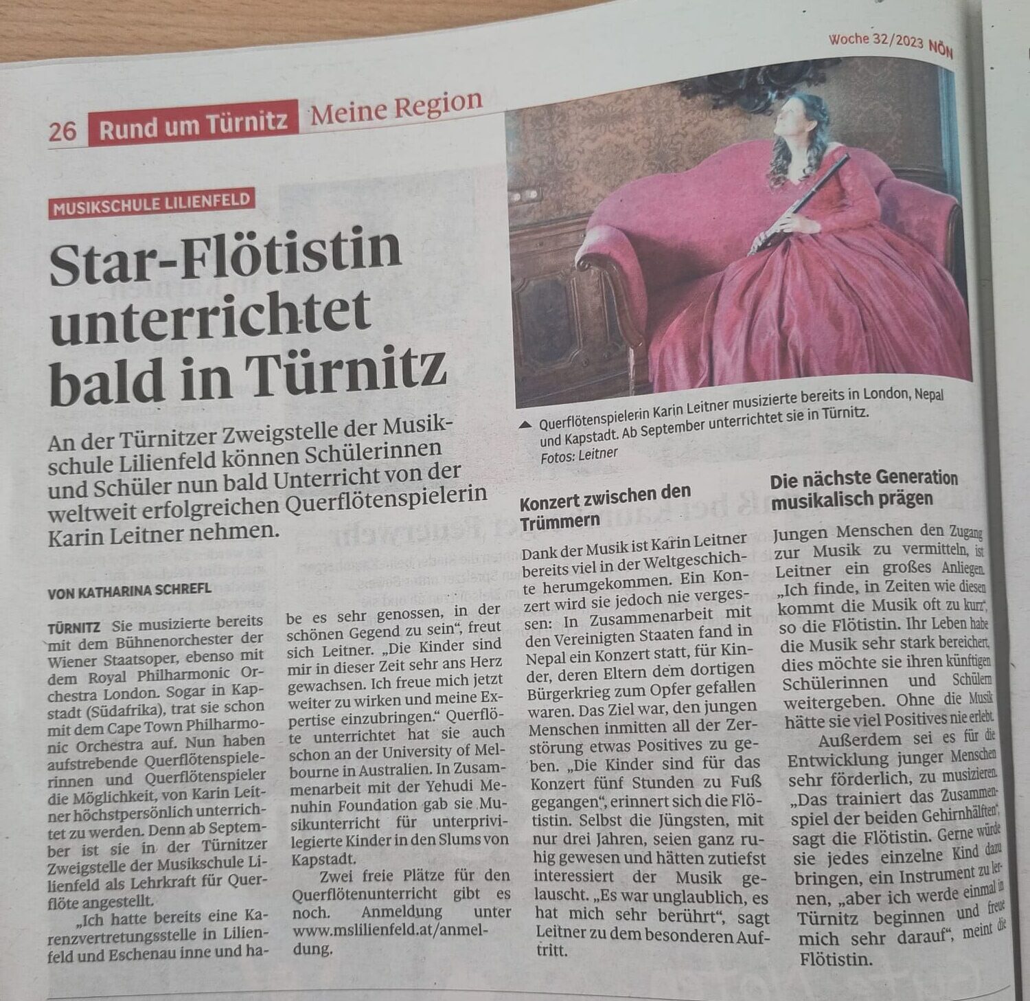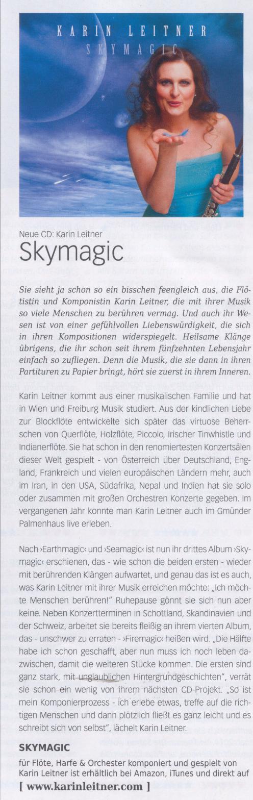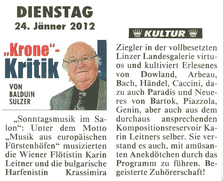 “Reiche Möglichkeiten der Gestaltung brachte die Flötistin Karin Leitner ein, als sie, mit schönem Ton und einfühlsamer Phrasierung Apartes von Fauré und Enescu, sowie u.a. Reinecke ausführte.” (Die Presse 1995, Vienna)